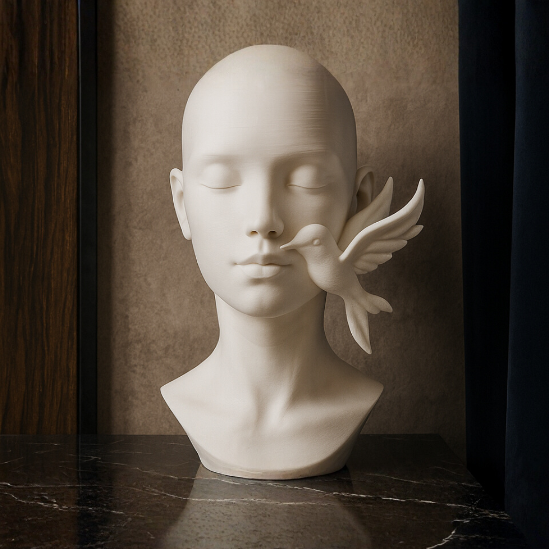 Clave sculptură poetică, bust alb mat, sculptură minimalistă, artă modernă, colibri decorativ, sculptură liniște, decor zen, accent artistic, Homentum