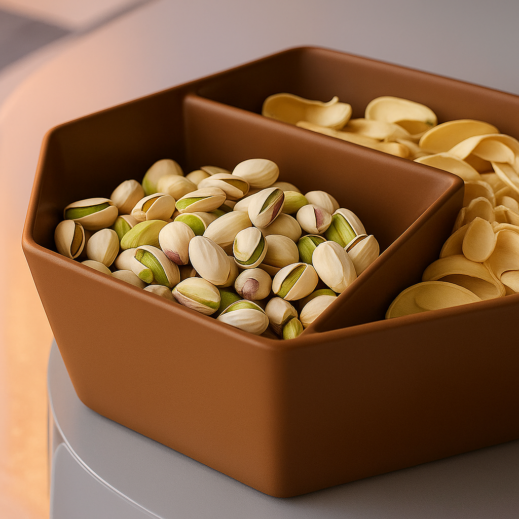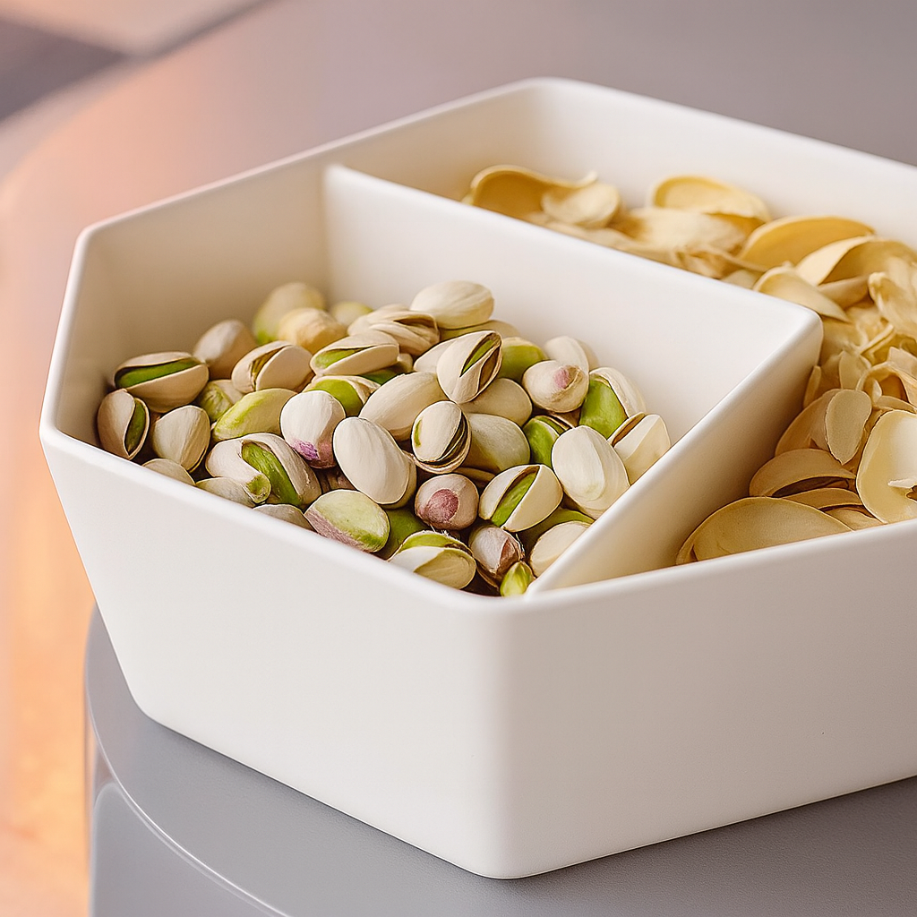 bol duo, bol dublu, pistachio bowl, bol pentru gustări, homentum, bol design modern, bol geometric, castron 3D print, servire minimalistă