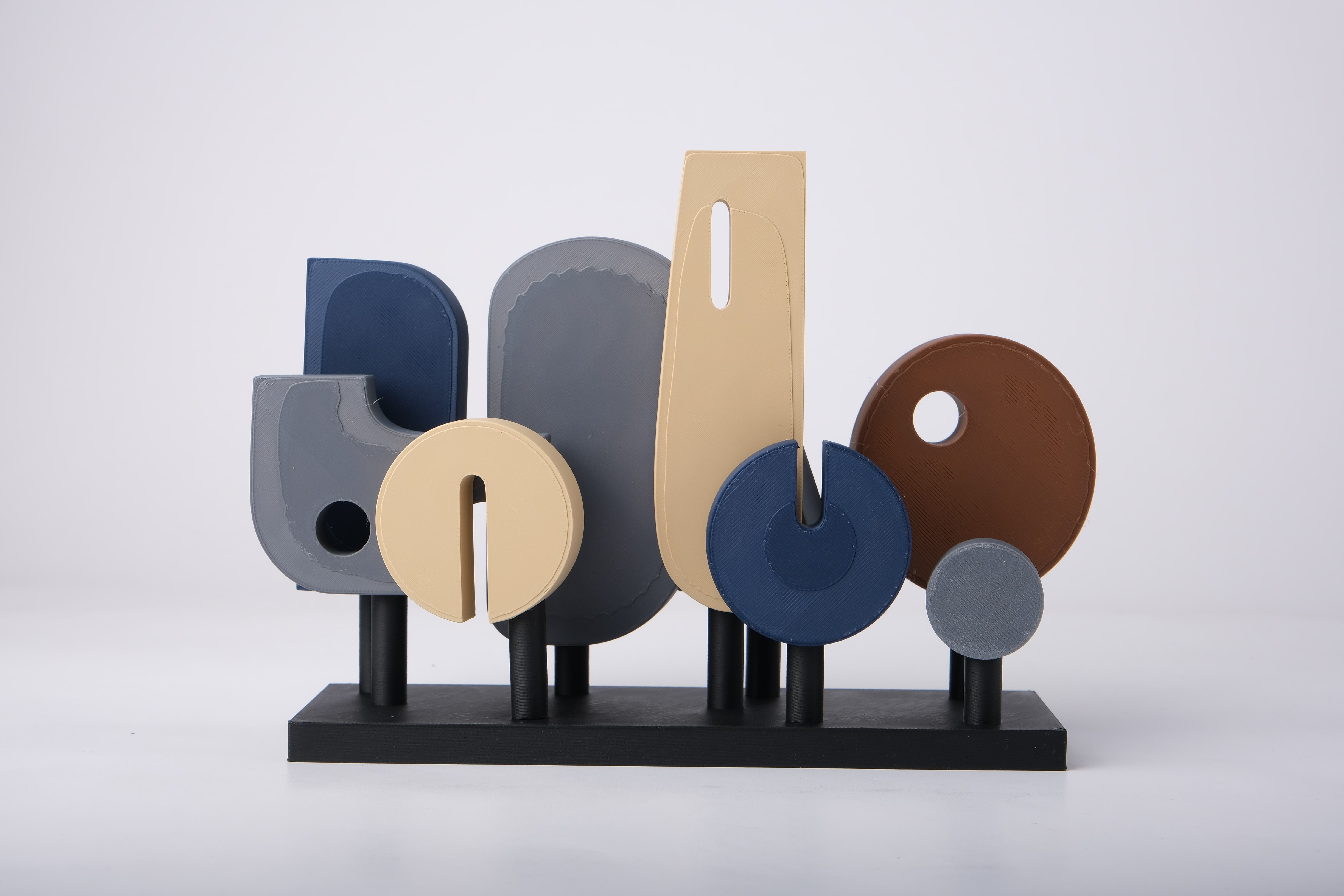 Eleganță minimalistă pentru casa ta. Idolo reinterpretează liniștea naturii prin forme esențiale: discuri, arce și coloane moi se așază pe o bază neagră pentru un efect arhitectural, cald și rafinat. Paleta mată – nisip, ardezie, bleumarin și cacao – aduce profunzime și ritm, ușor de stilizat pe comode, rafturi sau birou.