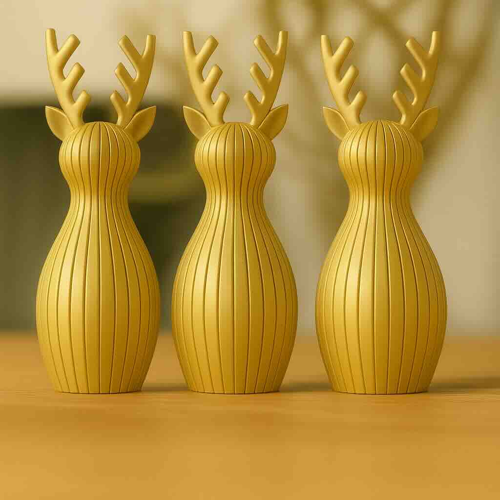 Norel este un set de 3 reni decorativi sculpturali, creați pentru a aduce farmecul sărbătorilor într-o formă elegantă și minimalistă. Fiecare piesă are o siluetă fluidă, inspirată din figura grațioasă a renului, accentuată de striații verticale fine ce creează reflexii delicate și profunzime vizuală.