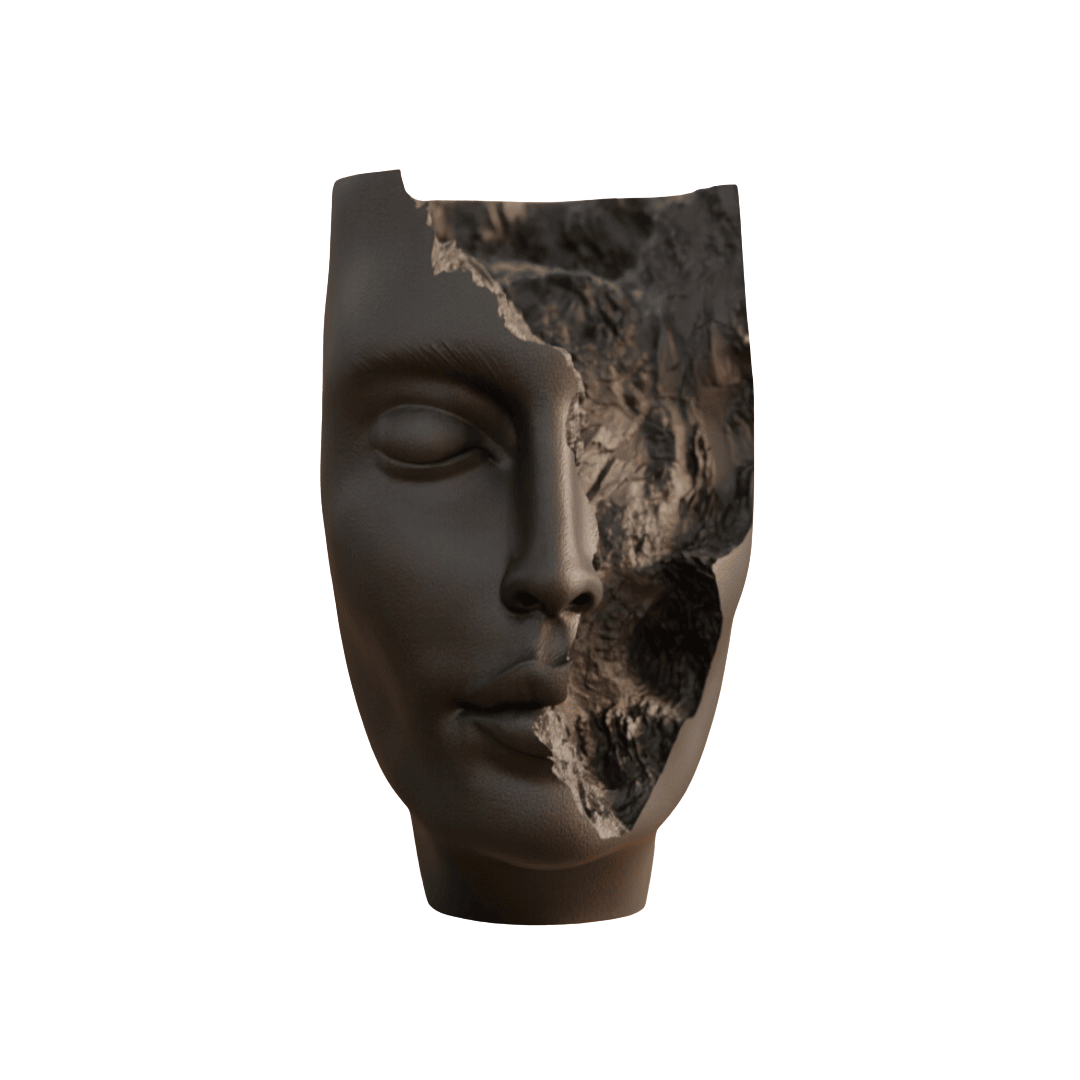Numa sculptură modernă, bust abstract, The Hollow Face, artă contemporană, decor minimal, sculptură 3D imprimată, negru mat, vulnerabilitate, echilibru, Homentum