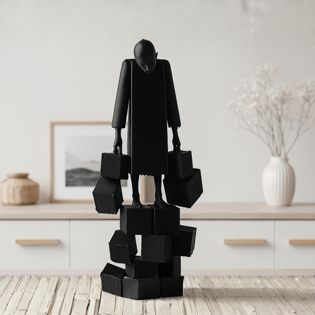 Așază Pesante pe o consolă, o masă de birou sau într-un colț dedicat artei. Este o sculptură care nu doar decorează, ci provoacă gândirea — aducând profunzime și echilibru vizual oricărui spațiu.