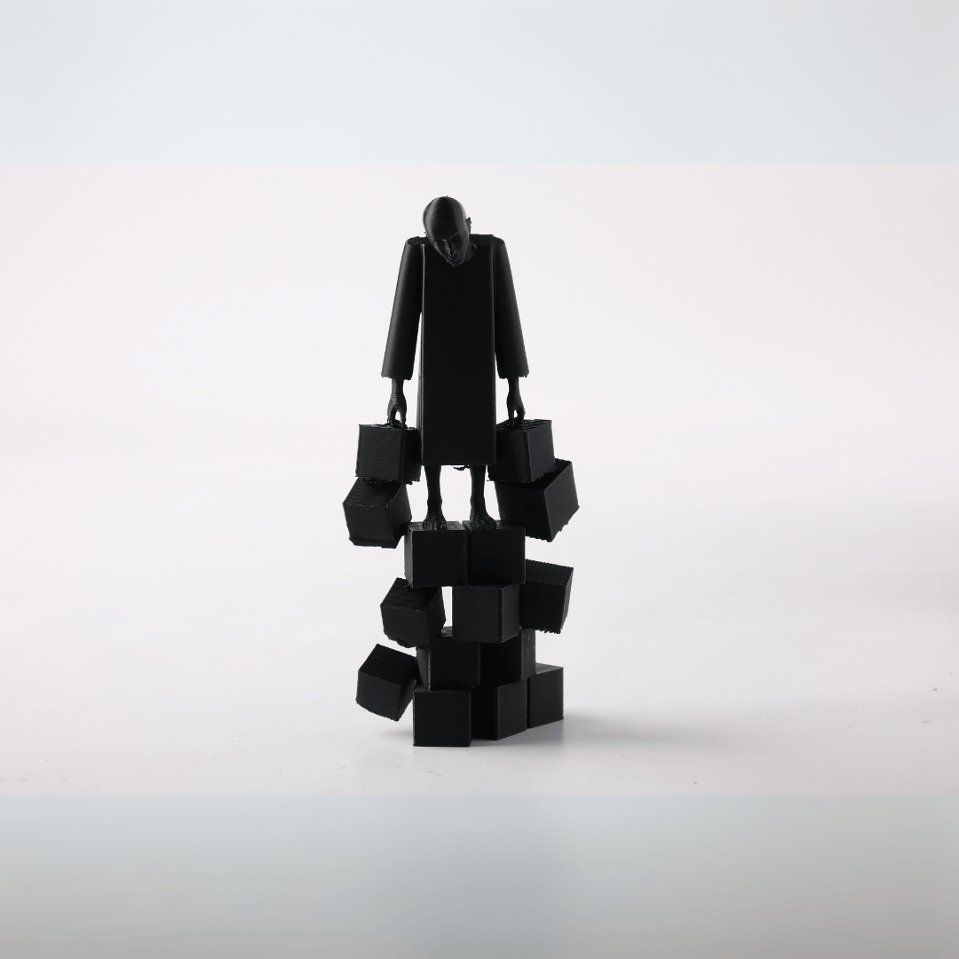 Pesante explorează tema greutății pe care o purtăm – fizic, mental sau emoțional. O siluetă umană fără chip, stilizată până la esență, stă pe un turn fragil de cuburi, fiecare simbolizând provocările, responsabilitățile și luptele interioare care ne modelează. În echilibrul precar dintre stabilitate și prăbușire, sculptura vorbește despre reziliență și vulnerabilitate în același timp.