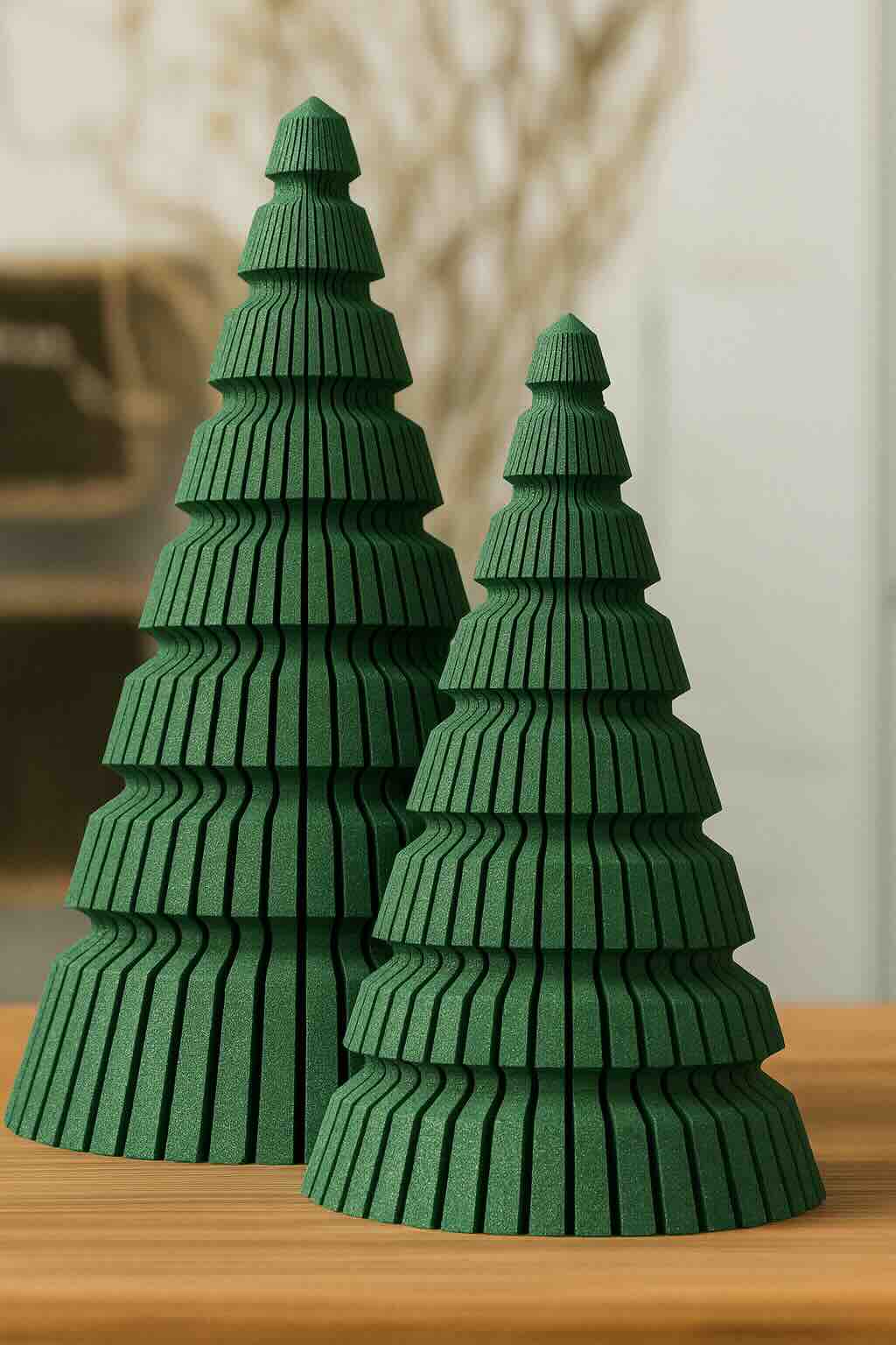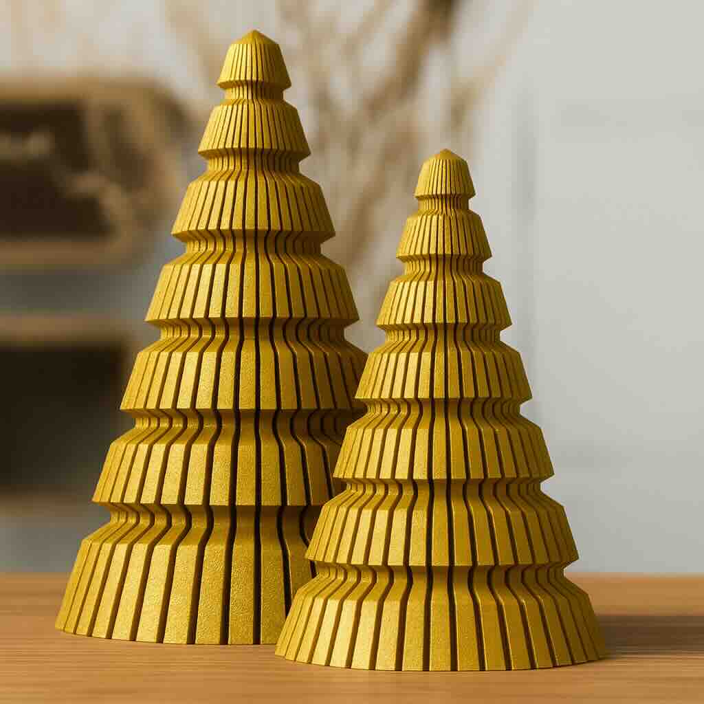 Pinarch este setul decorativ care aduce liniște, ritm și eleganță în atmosfera de iarnă. Format din doi brăduți sculpturali de 13 cm și 17 cm, setul se remarcă prin textura ribbed, cu striații verticale care creează un joc delicat de lumini și umbre.