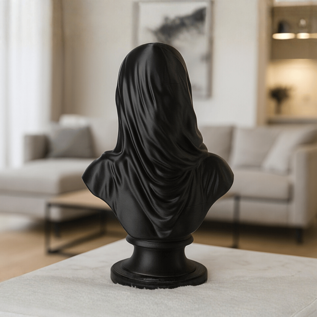 Plinto sculptură misterioasă, bust drapat negru mat, sculptură modernă, artă contemporană, decor minimalist, sculptură valuri fluide, accent elegant, Homentum