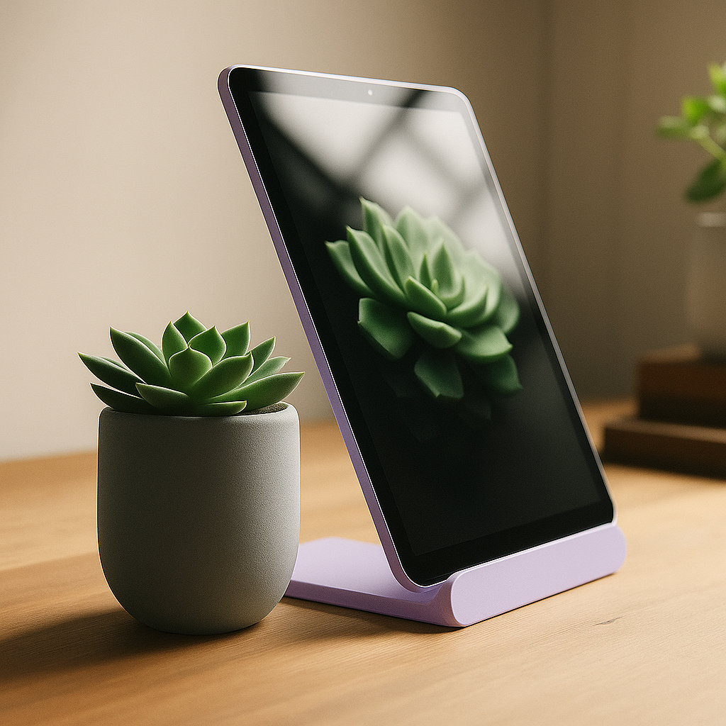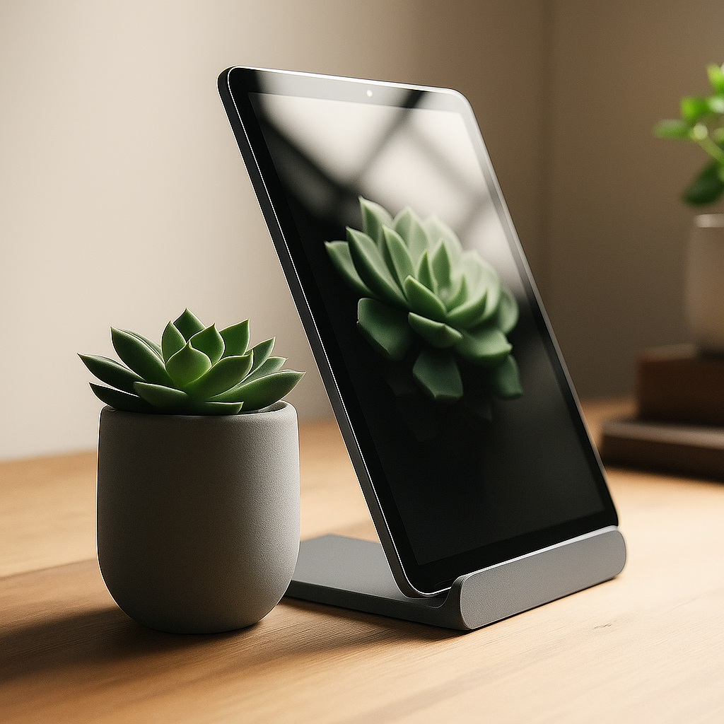 Liniile fluide ale suportului Senas pun în valoare tableta, menținând spațiul aerisit și rafinat. Un detaliu discret care adaugă claritate și eleganță momentelor tale digitale.