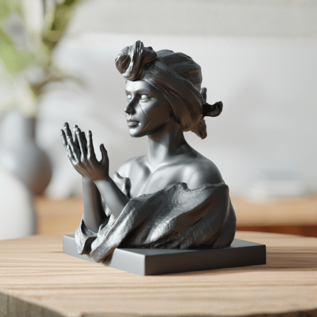 Solea îmbină grația și liniștea într-un bust feminin cu turban, surprins într-un gest delicat al mâinilor. Finisajul negru mat accentuează volumul drapajului și profilul serin, oferind o prezență sculpturală rafinată în orice decor.