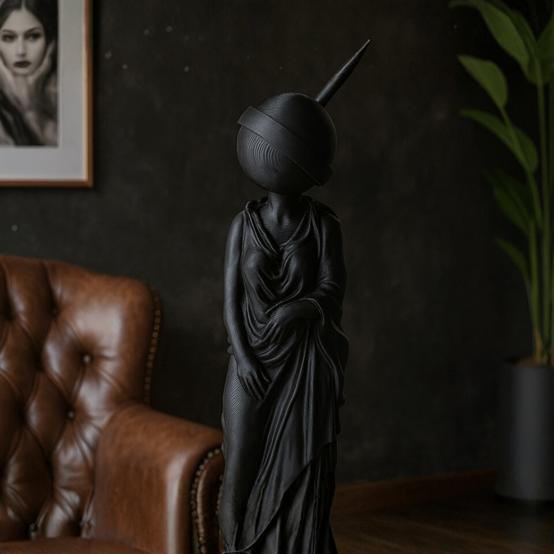 Vamos nu este doar un obiect decorativ, ci o declarație artistică. Cu un finisaj negru mat și un contrast puternic între forma tradițională și elementul ludic, piesa vorbește despre confuzia modernă dintre rațiune și distragere, despre nevoia de a privi viața cu detașare și autoironie.